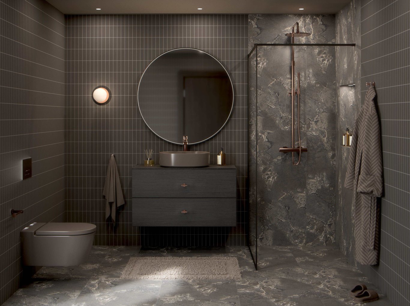 Hovedfargene består av dype, mørke toner som navy, sort, mørk grå, mosegrønn og brun. Fargepaletten holdes ton-i-ton med lite kontraster, noe som gir et dempet og sofistikert uttrykk. Materialbruken består av marmor, betong og mørke tresorter som valnøtt eller mørk eik. Fliser kan ha naturstein-look, være i mørk terrazzo eller glaserte mørke varianter med dybde og struktur. Armaturer i sort eller mørk messing tilfører ekstra dybde og gir en luksuriøs følelse.
